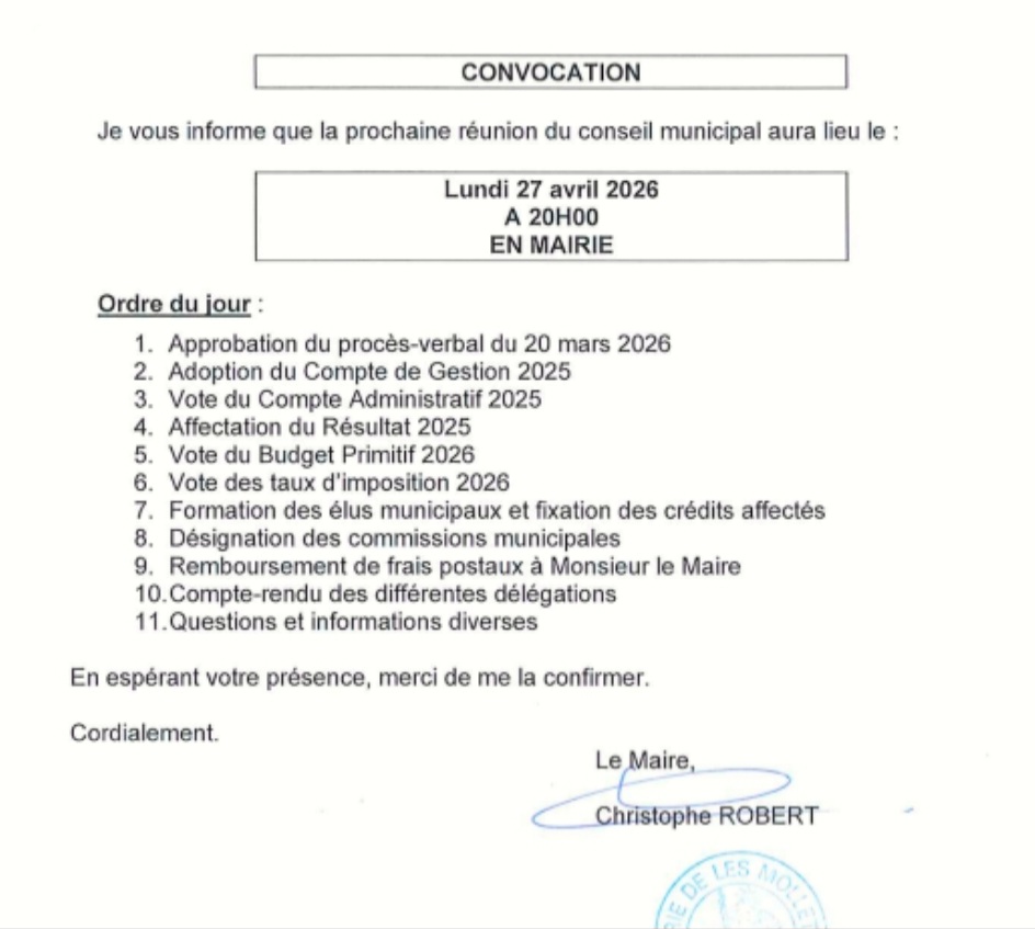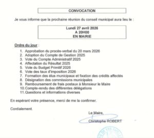 Conseil Municipal le Lundi 27 Avril 2026 à 20h