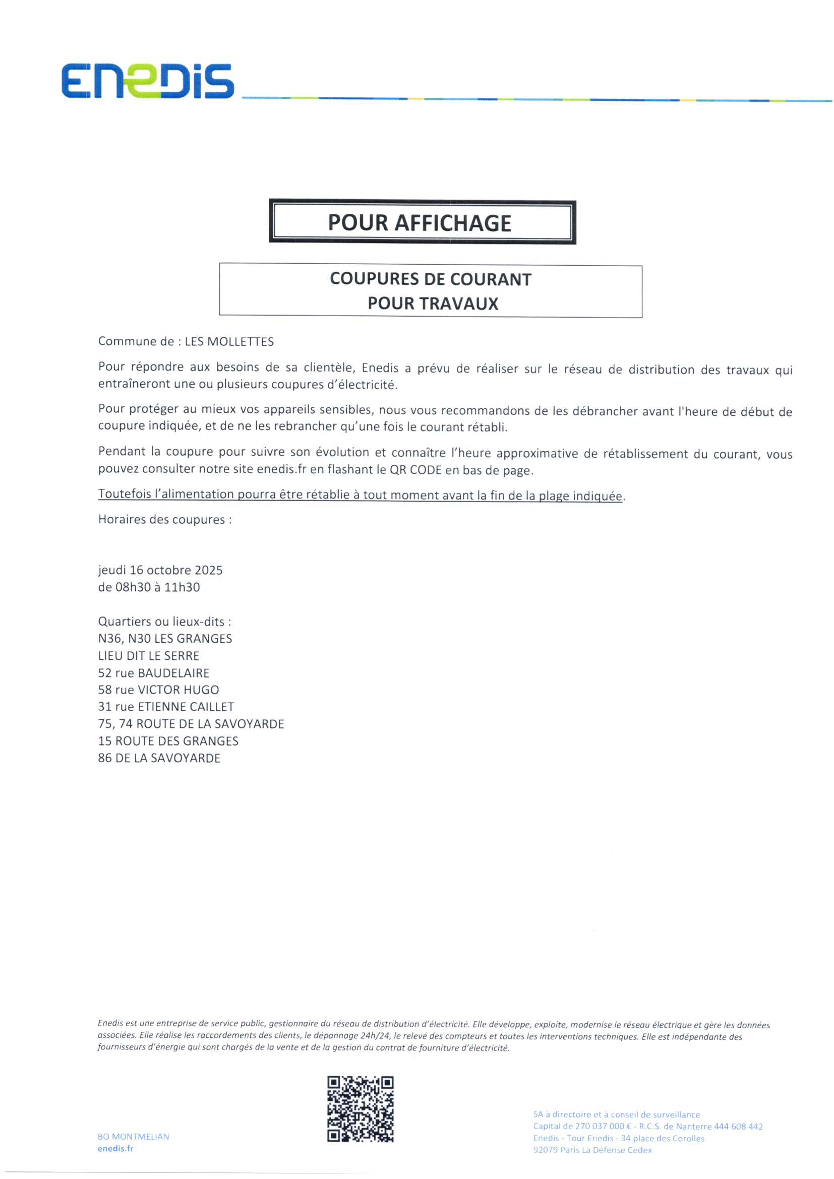COUPURES DE COURANT ENEDIS 16 OCTOBRE 2025 COMMUNE DE LES MOLLETTES